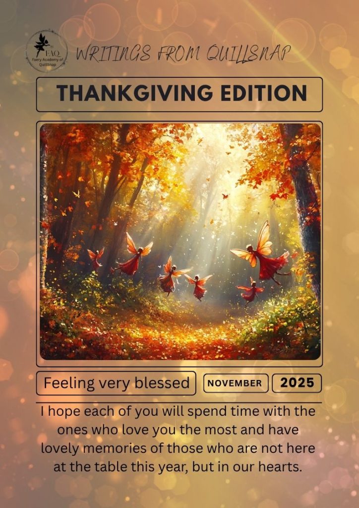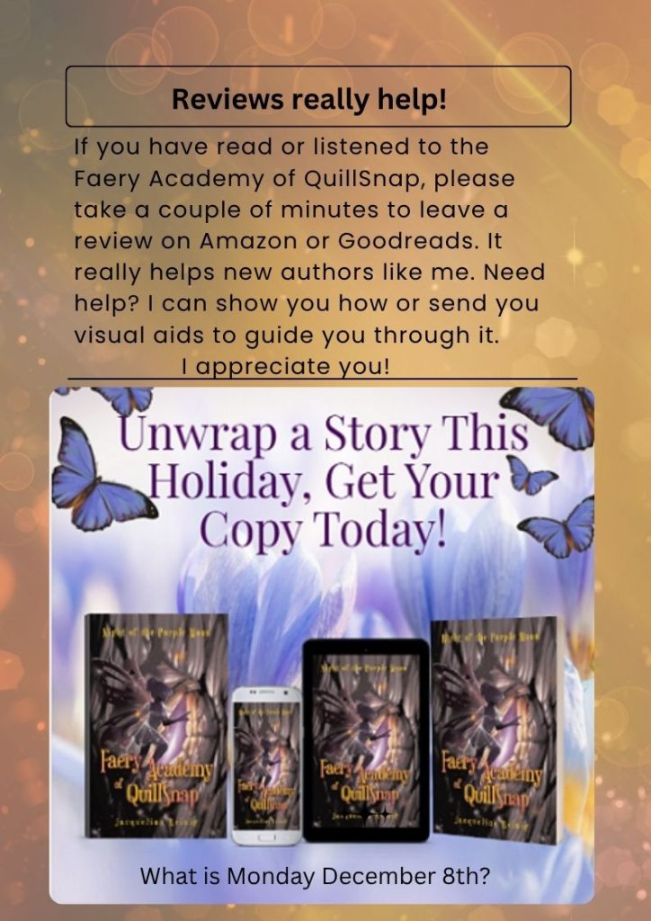 November Newsletter-Writings from QuillSnap! November Newsletter-Writings from QuillSnap! See 11/27 post for the additional info of giving the perfect gift! Visitor Tracker: 98 By Jacqueline Reinig Posted: November 26, 2025 Category: BLOG Tags: #bookreviews, #feelingblessed, #novembernewsletterwritingsfromquillsnap, #whereisquillsnap, #writingsfromquillsnap, Faery Academy of QuillSnap Feel the Magic! Read for yourself or listen to Maria Nicola Johnson narrate! The More Info about the Perfect Gift- A Faery Academy QuillSnap book-wrapped and sent fo you!